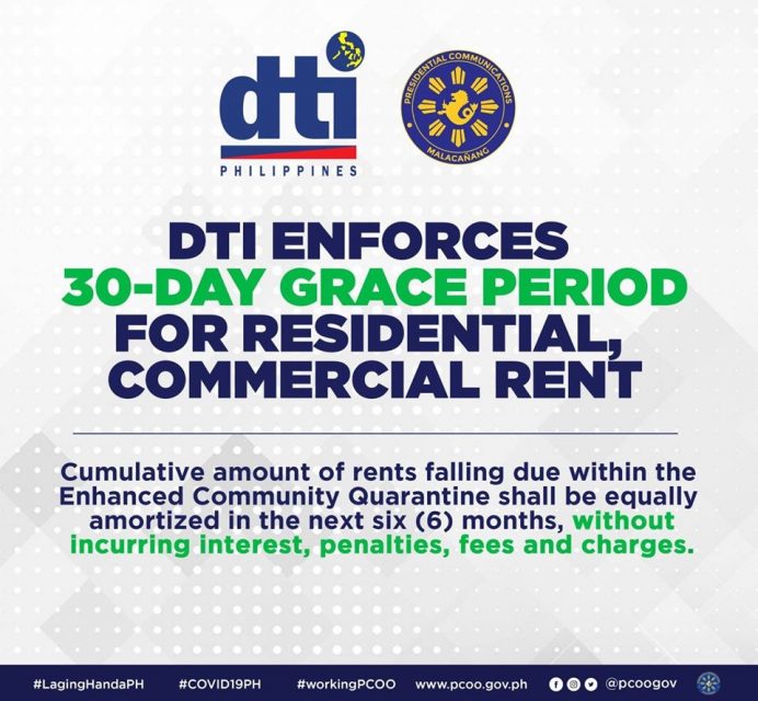 To provide economic relief during the COVID-19 crisis, DTI and DOF have imposed a mandatory 30-day grace period for payment of (a) residential rent; (b) commercial rent by MSMEs; and (c) loans.